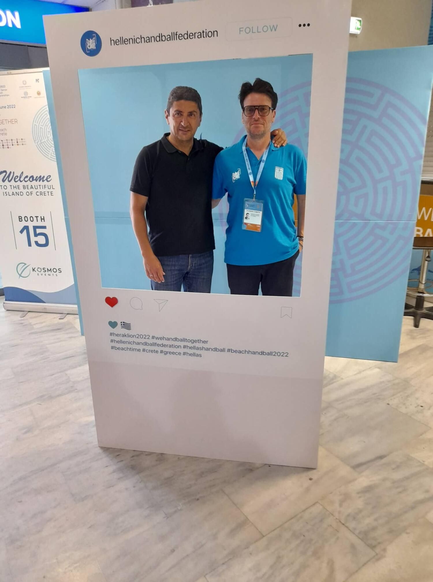 The Deputy Minister of Sports visited the pavilion of the 2022 World Championships (Junior - Youth and Men's - Women's) located in the arrivals area of the airport and together with the Presidents of the Organizing Committees were photographed in front of the specially designed "photo booth".