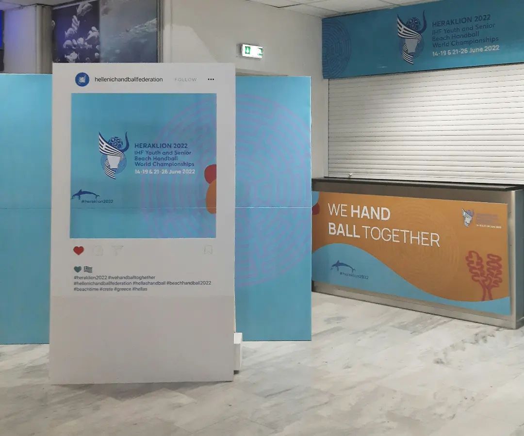Όλοι όσοι καταφτάνουν στο αεροδρόμιο καταλαβαίνουν αμέσως ότι αυτές τις ημέρες θα διεξαχθεί ένα πολύ μεγάλο γεγονός, τους μοιράζεται ενημερωτικό φυλλάδιο, ενώ μπορούν να φωτογραφηθούν στο photo booth και να ανεβάζουν τη φωτογραφία στόρι στο Instagram με ταγκ την Ομοσπονδία Χειροσφαιρίσεως (hellenichandballfederation)